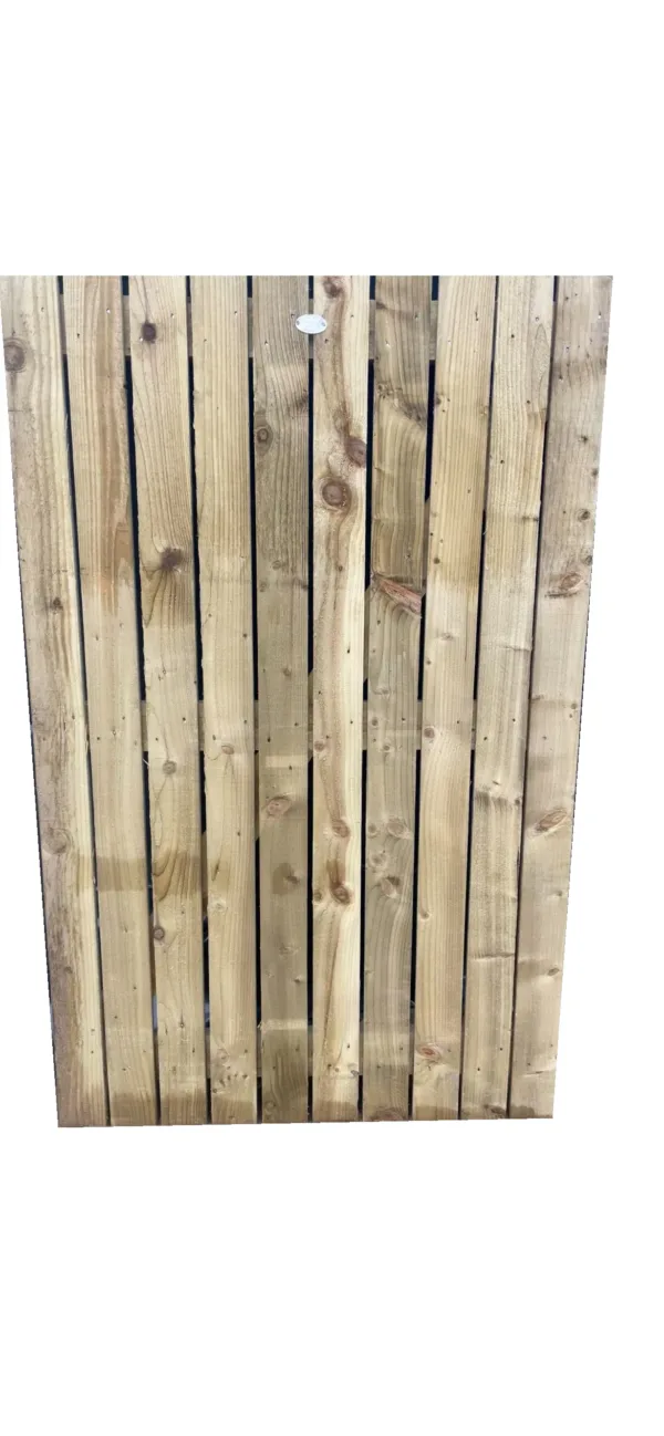 A sturdy gate suited to areas that receive a lot of wind, made with 100mm x 19mm boards and 100mm x 38mm backing rails. The timber is all pressure treated.